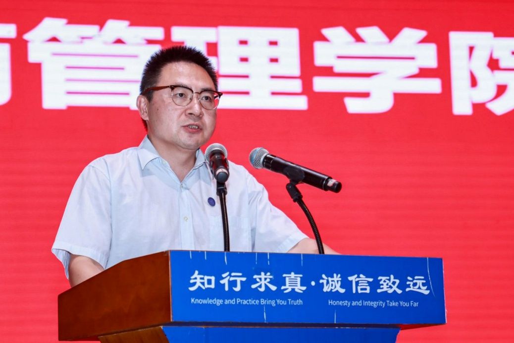工商管理学院院长兼MBA教育中心主任吴海涛教授为全体新生讲授“院长第一课”。他结合学院76年办学历程,阐述何为“有深厚历史底蕴、有强大办学实力、有鲜明办学特色、有远大办学理想”的“四有商学院”。近年来,工商管理学院围绕“经管法技”融通人才培养模式积极推动“文文融通、文理融通、科教融通、产教融通、内外融通”五大融通体系建设,着力打造“书香工商、礼冠工商、志愿工商、意扬工商、经管共商、榜样工商”六大品牌,系统构建融通型、高质量育人平台,培养了一批兼具专业深度与实践能力的优秀学子。他指出,21世纪,人工智能正以“智能”重构商业全景,从生产端、消费端到管理端的数据决策,都在发生更加深刻的改变。这场变革带来的不仅是挑战,更是大家作为新一代商科人的独特机遇。他勉励同学们,以“知”拓界、打破专业壁垒,以“行”固本、锤炼扎实本领,以“创”破局、努力成就大器,为强国建设贡献中南大商科力量。