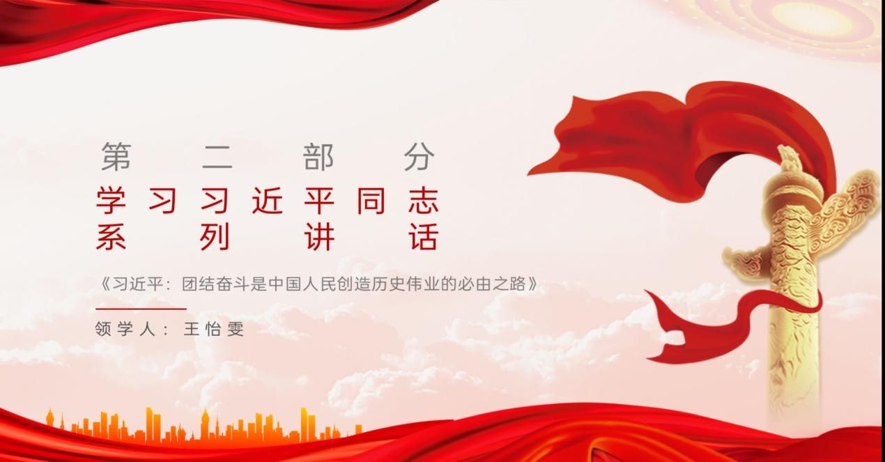 王怡雯同学领学《习近平:团结奋斗是中国人民创造历史伟业的必由之路》。她以2016年纪念红军长征胜利80周年讲话为起点,系统梳理了2018年春节团拜会、全国两会、纪念五四运动100周年大会、2021—2025年历次新年茶话会和全国劳动模范表彰大会等重要讲话,集中呈现“团结就是力量、奋斗即幸福”“新时代是奋斗者的时代”“14亿多人手拉手向未来”等核心论断,突出强调团结奋斗是中国共产党和中国人民最显著的精神标识。