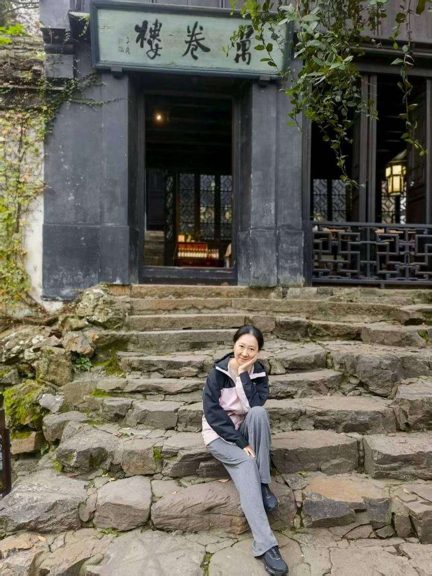 写完这篇文章后,校友徐娅玮发来一张更应景的照片,她说,也许四十多岁之际,这张更符合心境,一节节台阶需要攀升,后方是万卷楼,我们一直在攀岩去往真理之处,而彼时她展现了最朴素的素颜,平常心,不畏惧,不执着,不放弃,一切都是最好的安排。