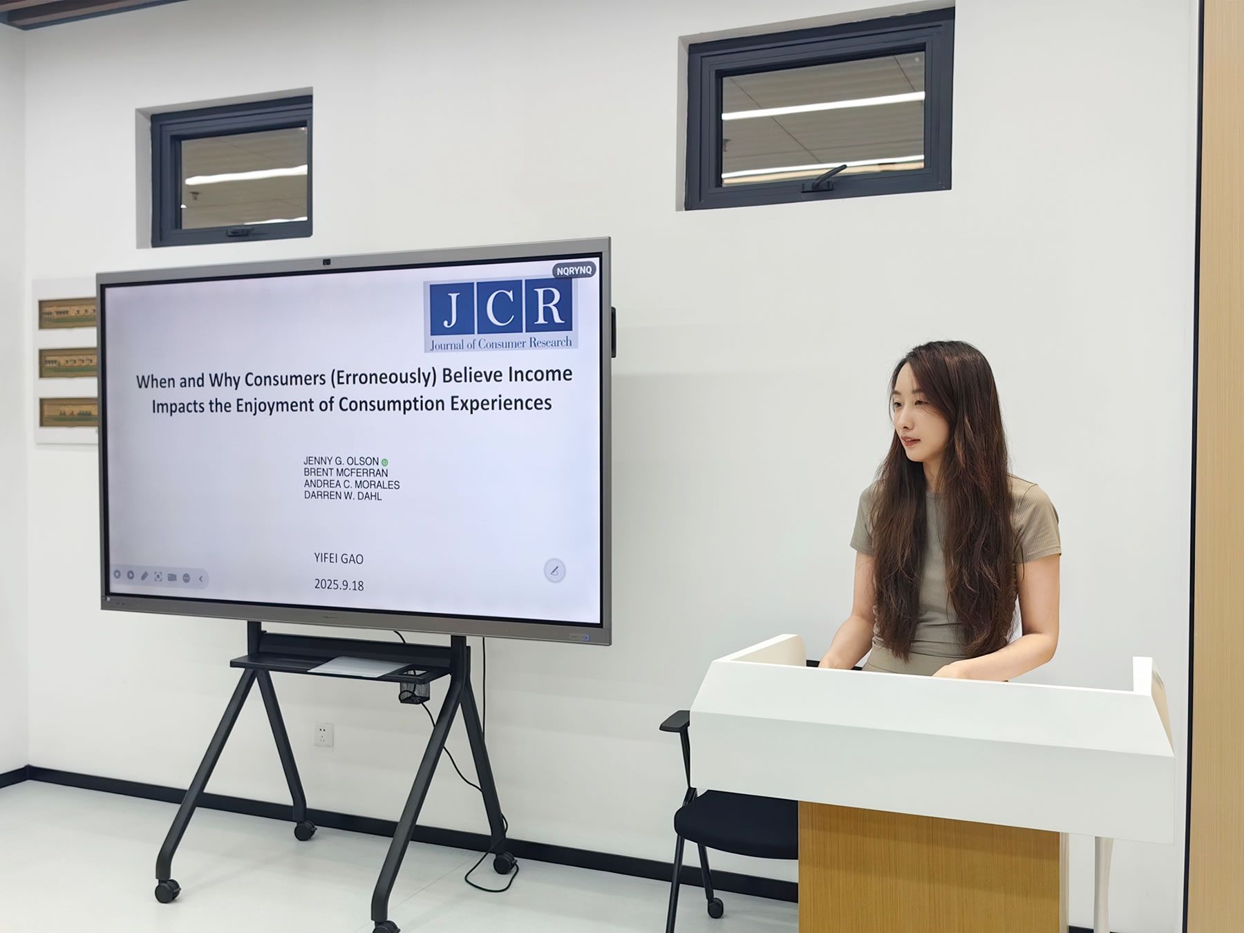 工商管理学院的老师、博士生、硕士生、本科生参与了本次文献研讨活动,段珅老师主持了本次活动,并对文献进行了点评和答疑。本次博思堂的分享者是2025级营销管理系博士生高艺菲同学,分享的论文题目为:When and Why Consumers (Erroneously) Believe Income Impacts the Enjoyment of Consumption Experiences(作者:Jenny Olson, Brent Mcferran, Andrea Morales, Darren Dahl)。