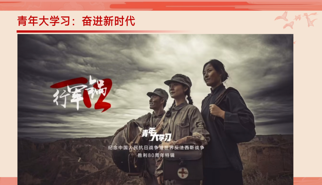 青年大学习:奋进新时代。活动第四项,主持人带领大家一起观看最新一期青年大学习,影片带领我们回顾往昔,让我们穿越历史硝烟,见证了中国人民在抗战中的英勇与坚韧。作为新时代青年,我们站在历史的新起点上,要铭记历史、缅怀先烈、珍视和平、开创未来。