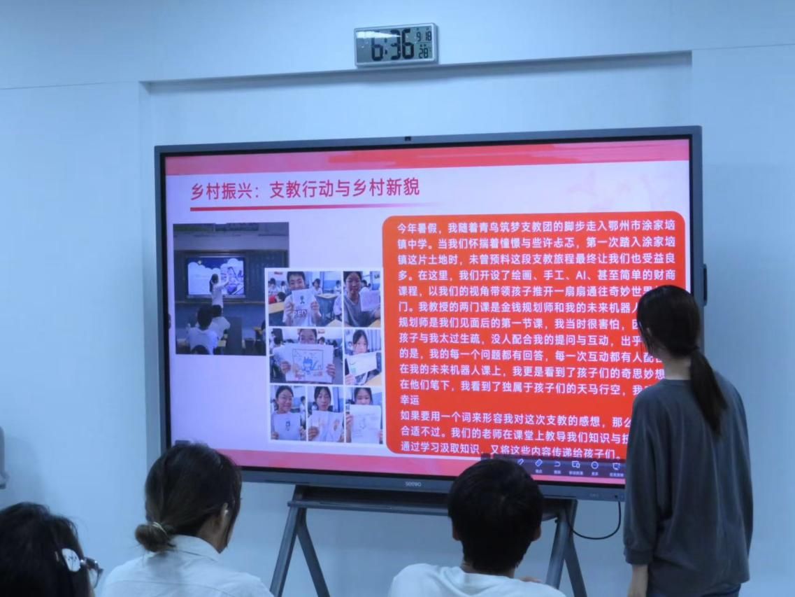 乡村振兴:支教行动与乡村新貌。活动第六项,刘青青同学上台分享了一些自己的支教行动经历与观察到的乡村新貌。讲述了她在偏远乡村课堂上为孩子们传授知识、开设兴趣课程的点滴,也展示了当地在教育设施改善、特色产业发展、人居环境提升等方面的新变化,同学们深刻体会到“把青春奉献在祖国需要的地方”的意义。