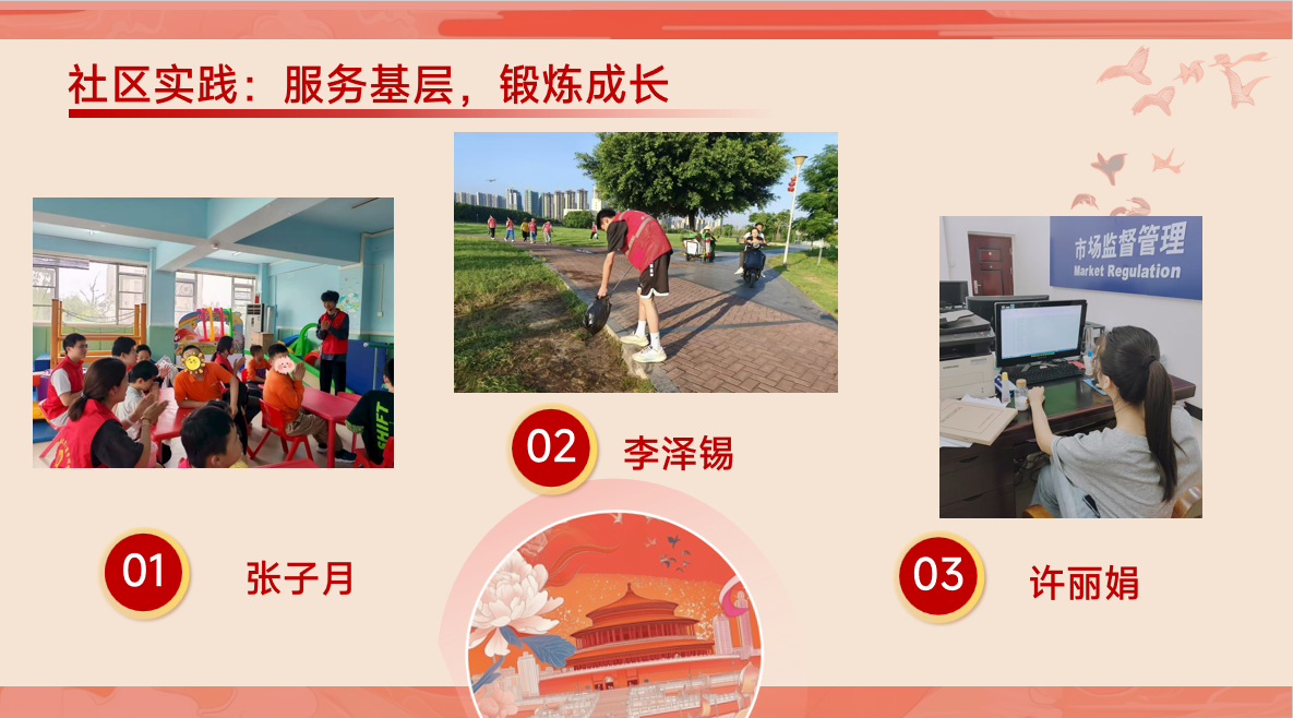 社区实践:服务基层,锻炼成长。活动第八项,部分同学分享了自己的社区实践经历。其中,有三位同学分别展示了自己在社区等不同地方开展的志愿服务和实践活动的照片。同学的分享让大家认识到社区实践让我们走出校园,真切感受到“把小事做好就是担当”。大家在交流中进一步明确了“从身边事做起、为社会贡献力量”的实践方向。