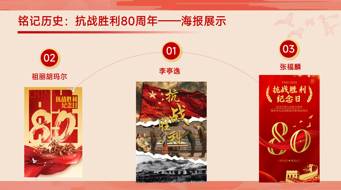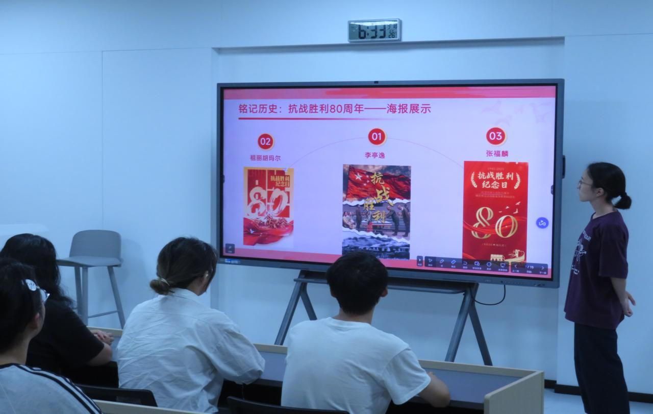 铭记历史:抗战胜利80周年。活动第五项,部分同学根据纪念中国人民抗日战争暨世界反法西斯战争胜利80周年的主题,自主设计创作海报并展示,作品中展示了对新时代青年传承红色精神的展望,文字与画面的结合极具冲击力,体现出在新时代新征程中青年铭记历史,弘扬抗战精神的意志和决心。