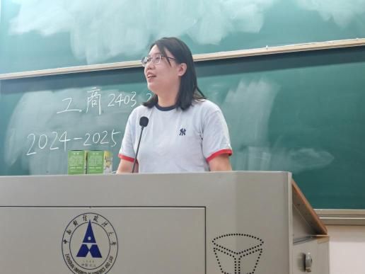 班委述职结束后,辅导员上台作总结讲话,既肯定了两班大一学年的成长,也为新学期发展指明方向。辅导员首先对班委的付出给予高度评价:“从学风建设到班级活动,班委们用责任心扛起了服务职责,班级凝聚力、学业成绩的提升就是最好的证明。”随后,她明确了新学期三大核心安排:一是学风深化,双学位计划,助力同学明确学业目标;二是实践赋能,鼓励同学们参与实习,创赛和社会实践,推动理论与实践结合;三是思想引领,以团日活动、主题班会为载体,强化青年责任担当教育。