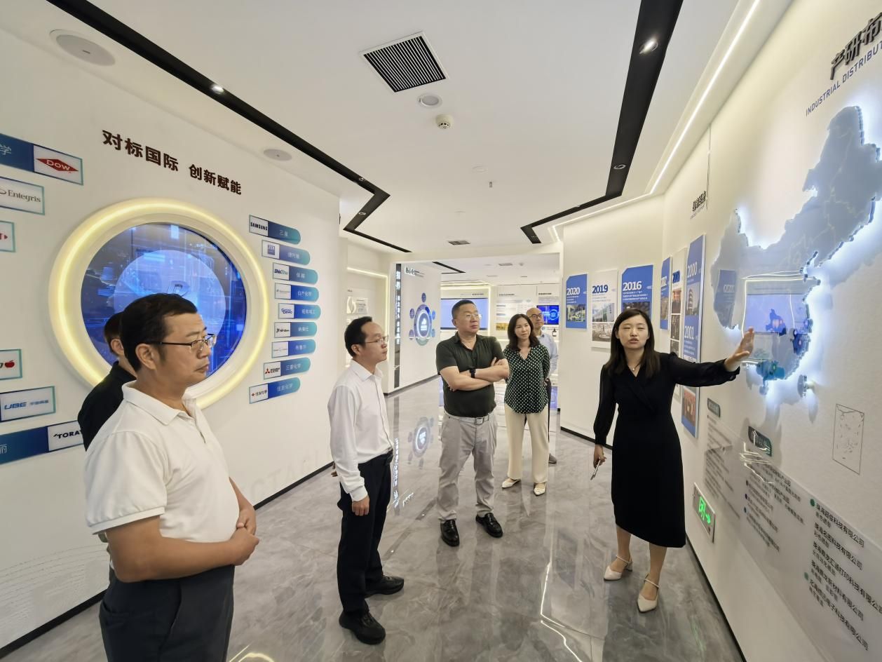 吴海涛院长一行首先参观了湖北鼎龙控股的光刻胶实验室、企业展厅,朱顺全总经理详细介绍了湖北鼎龙控股的发展历程和产业布局。企业自2000年成立,于2010年上市,鼎龙一直致力于关键大赛道上尖端材料的研发生产。企业主要聚焦集成电路材料、半导体显示材料、打印复印通用耗材等几大业务板块,特别是在抛光垫、柔性显示材料等“卡脖子”技术取得了突破性成果,“武汉先进功能材料联合创新实验室”的协同创新模式在同行中处于领先水平。