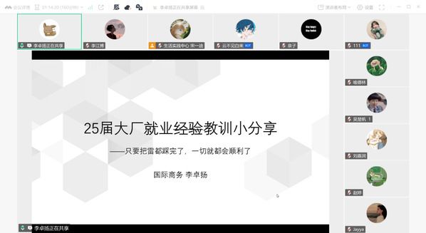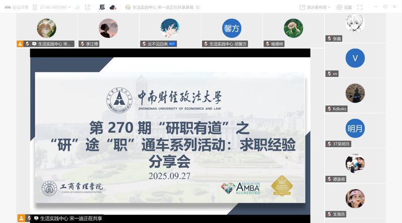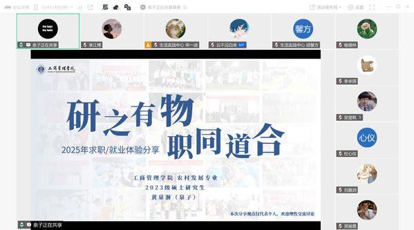 为帮助各同学适应快速变化且高度竞争的职场环境,稳住求职心态、提升就业技巧,顺利在未来求职路上脱颖而出,工商管理学院第270期“研职有道”之“研”途“职”通车系列活动——求职经验分享会以线上会议形式于2025年9月27日下午14:00在腾讯会议顺利进行。本次活动邀请到2023级优秀校友黄泉淋师兄和李卓扬师兄为大家进行分享,由院研会生活实践中心宋一迪主持,工商管理学院与法学院各年级研究生同学踊跃参与。