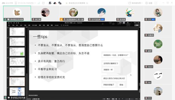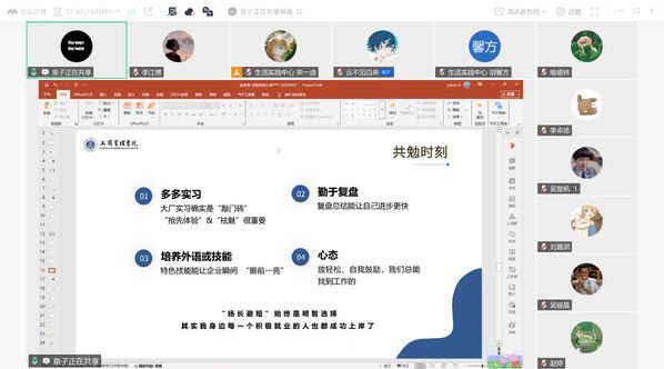 他指出,要巧妙善用AI赋能面试经验,打造自己的面试文档,要快准狠展露自信大方的自我介绍,要通过维度、自评、比较来明晰offer选择。同时以多多实习、勤于复盘、培养技能、良好心态来与同学们共勉,保持“不后悔”的求职初心,用扬长避短的明智选择积极求职、顺利上岸。