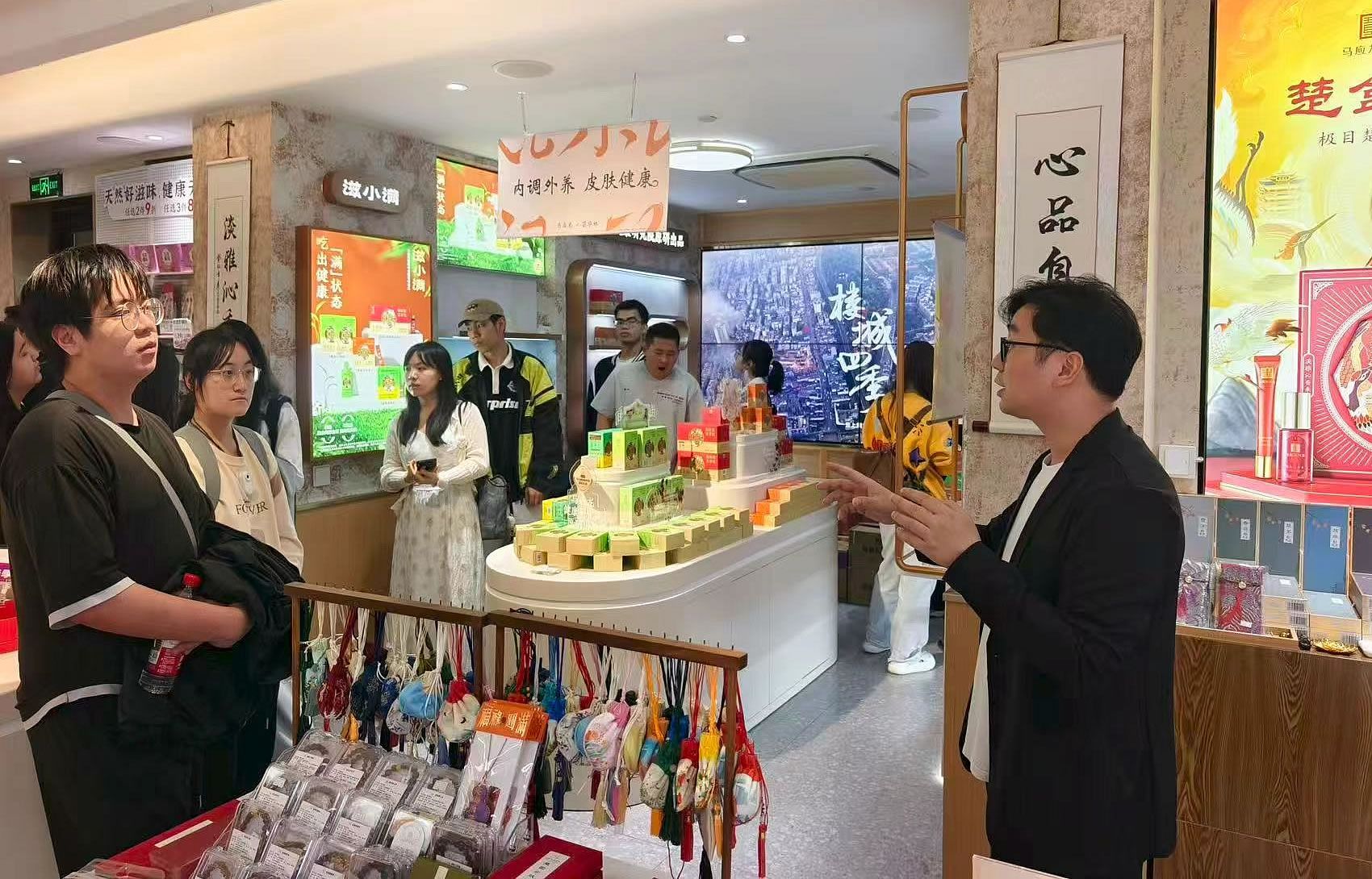 9月24日下午2时,应斌教授带领学生再次出发,前往马应龙昙华林线下体验店开展调研。负责人在店内接待并详细介绍了品牌在昙华林布局体验店的战略考量。随后,负责人逐一讲解店内陈设的大健康产品矩阵,涵盖肛肠护理、皮肤护理等多个品类,重点介绍了湿厕纸的药品级成分与清洁优势,进一步强化了同学们对产品与“健康厕所”战略关联性的