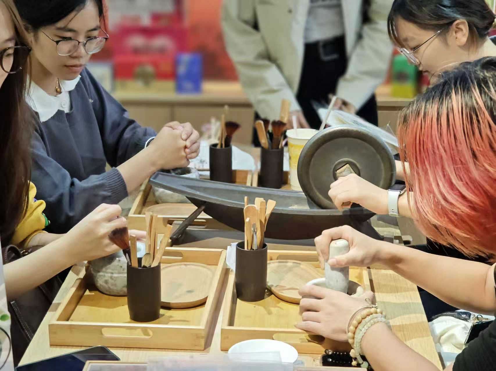 产品讲解结束后,特色非遗体验活动随即展开。同学们分为两组:一组在工作人员指导下制作草本香囊,将艾草、薄荷等原料放入石臼捶打后填充入布袋,感受传统制香技艺;另一组在老师示范下绘制漆扇,以现代审美演绎传统漆艺。欢声笑语间,同学们在动手实践中真切触摸到马应龙 “传统与创新共生” 的品牌底蕴。