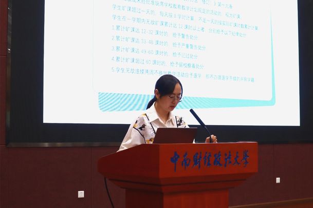 赵元元老师对研究生管理规范进行介绍与解读,着重讲述日常管理制度和研究生思政与奖助制度等内容。她指出,研究生应严格遵守学校各项规章制度,共同营造安全、有序、和谐的学习和生活环境。她结合案例对研究生进行安全教育建议他们可以充分利用学校心理中心和就业指导服务中心的各类资源,提升自身情绪调节与适应能力。