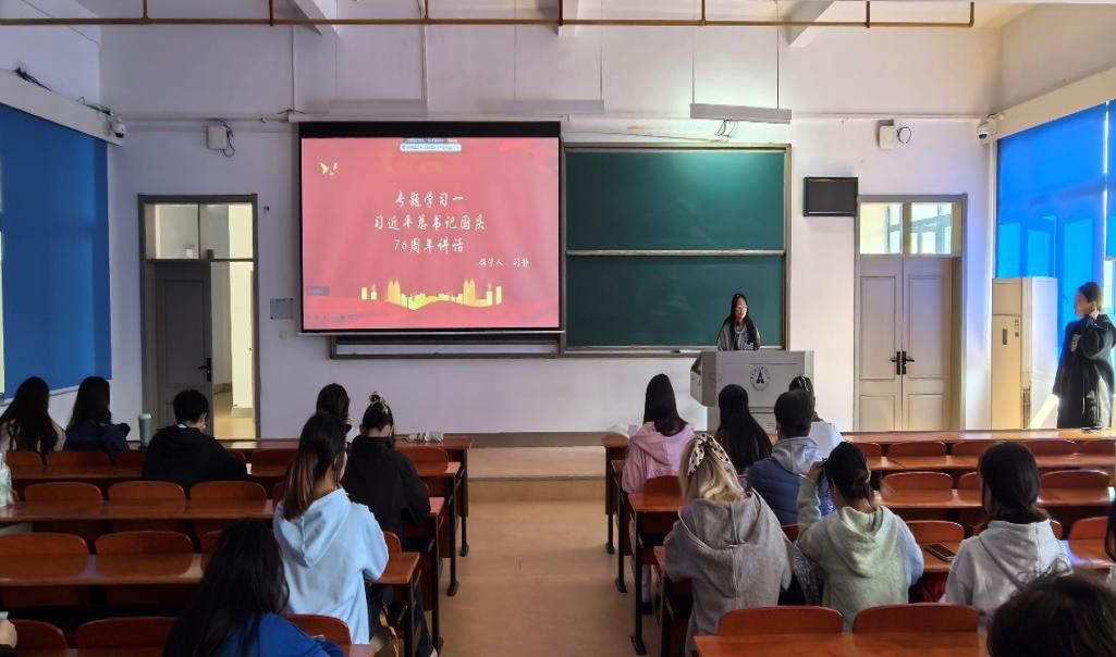 大会第二项,专题学习环节。刘静同学领学习近平总书记在庆祝中华人民共和国成立76周年时的讲话。习近平总书记强调,实现中华民族伟大复兴是前无古人的伟大事业。憧憬和挑战,都激发我们只争朝夕、永不懈怠的奋斗精神。我们要更加紧密地团结在党中央周围,锐意进取、埋头苦干,奋力谱写中国式现代化更加绚丽的篇章。