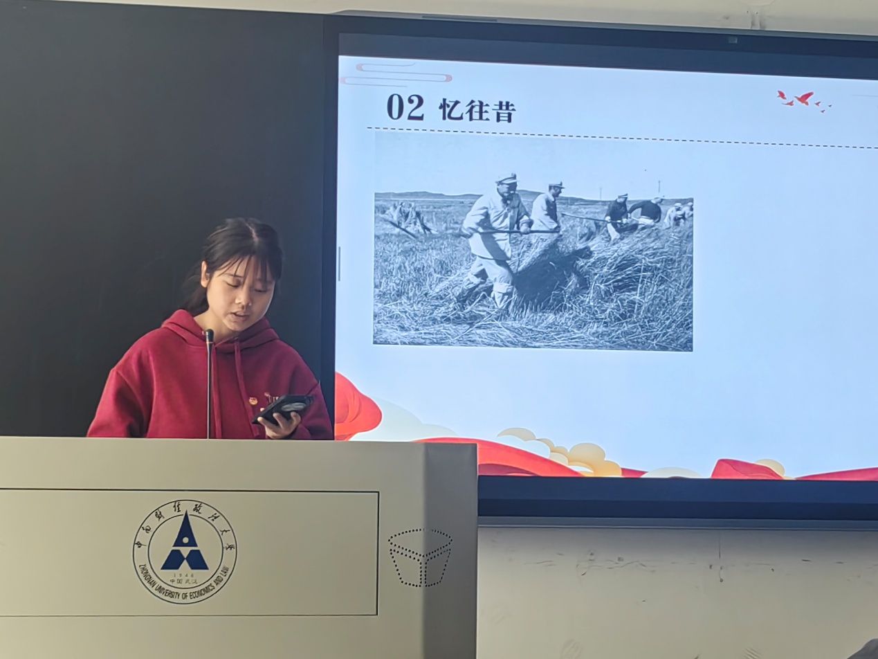 在第一部分,团支书王梦琦同学围绕“忆往昔”,带领同学们重温了百年峥嵘岁月,共同追溯了党和国家波澜壮阔的奋斗历程。将同学们的思绪引向了那个风雨如磐又热血激昂的年代。这段回顾筑牢了同学们的思想根基,更让大家从历史中汲取了不忘初心、砥砺前行的磅礴力量。