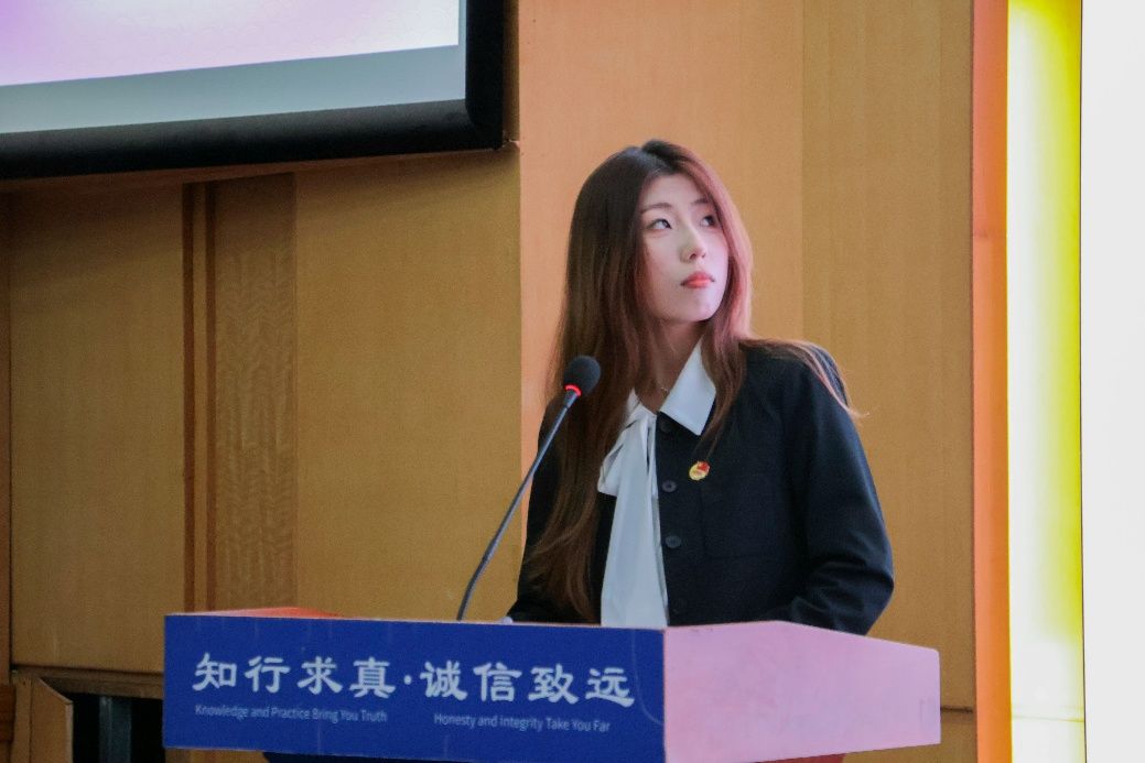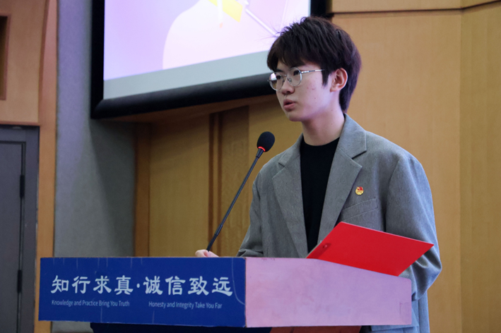 学院学生会主席团成员聂羽辰、第十八期团校培训学员代表刘佳琳、第十九期团校培训新学员代表马正蓉先后发言。聂羽辰回顾往期工商团学工作并汇报本学期工作计划,她鼓励大家在学习与实干中牢记服务宗旨,携手共促团学组织发展。刘佳琳同学结合自身发展经历,说明成长中勇于较真、不忘实践的重要性,呼吁同学们珍惜时光、乐于求真。马正蓉同学则号召同学们永葆求知欲,常怀责任心,以行动践行初心。