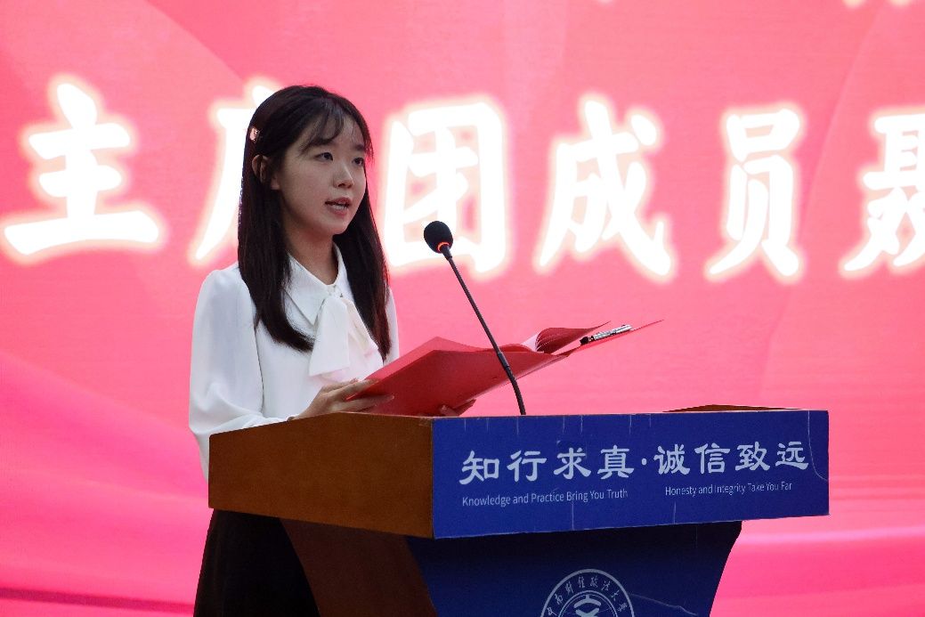 分团委组织部部长王宇轩向新学员介绍了青马班与团校培训班培养体系,并讲解团学志组织架构与考核标准。她表明,希望各位同学能够珍惜团学组织工作机会,在学习和实践中锤炼本领、坚定信念。