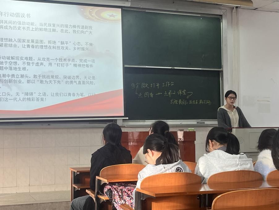 活动第五项,“命运与共——铸就青年的时代担当”。赖雨辰同学深入分析了全球性问题的复杂性与紧迫性,深刻阐述了构建人类命运共同体是应对挑战、共创美好未来的必然选择。她引导同学们跳出个体局限,以全球视野审视时代,清醒认识到各国前途命运紧密相连,她呼吁每位同学直面挑战,明确自身作为新时代中国青年所肩负的责任。