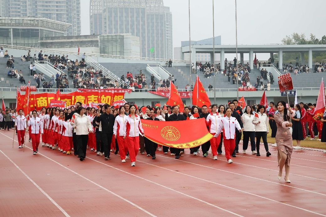 伴着激昂的《运动员进行曲》,工商管理学院运动员方阵步伐铿锵、身姿挺拔,嘹亮的口号响彻赛场,尽显工商学子的昂扬志气。他们将带着奋勇争先的信念,挥洒汗水、突破自我,用拼搏诠释青春的炽热,用奋进书写工商的辉煌。