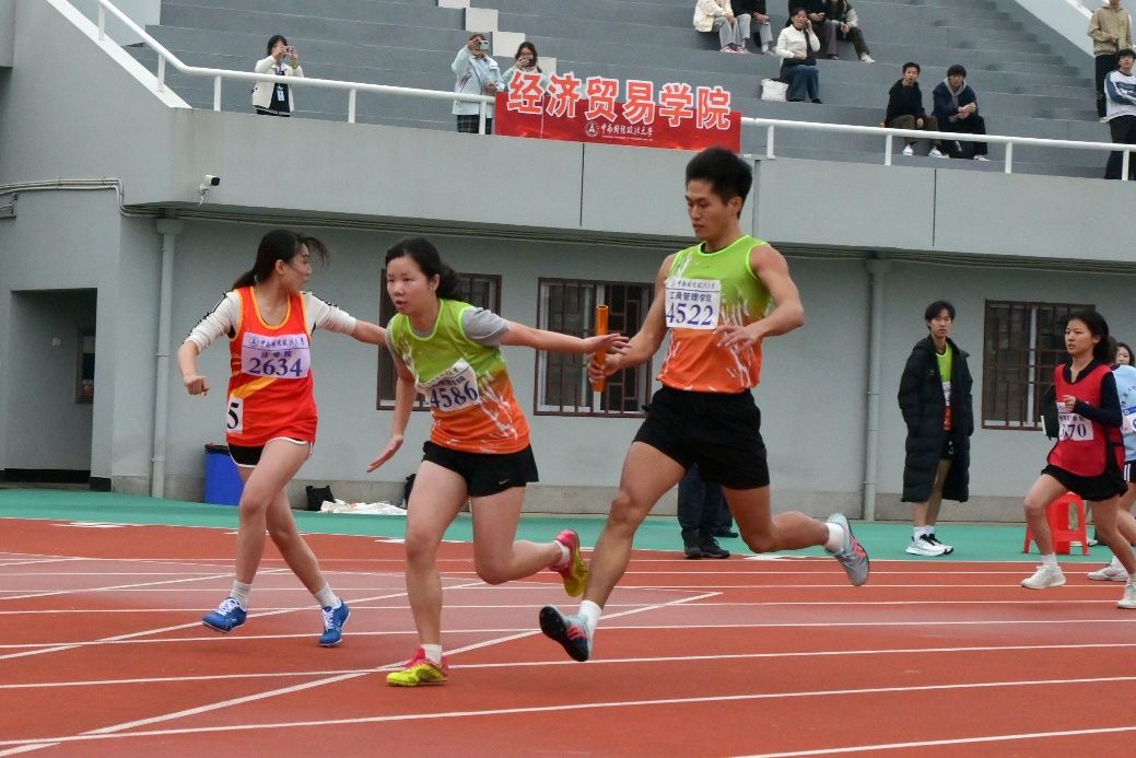 接力棒在手中传递,信念在心中凝聚。随着发令枪响,男子组首棒一马当先破风而出,虽在交接棒过程中略有失误,但后面选手迅速调整,全力冲刺拼搏,最终锁定第五名;女子组全程默契拉满,交接如行云流水,最后一棒顶住压力,带着队友期待冲破终点,斩获银牌。男女混合接力更显默契,男女选手交替接棒,每一次传递都藏着信任,凭借这份协作精神,工商再斩下一枚金牌。