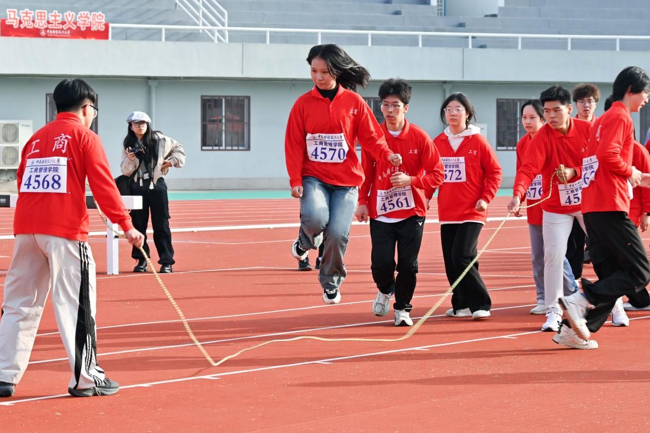 田径场上彩绳翻飞,8字队形灵动变换。工商运动员们脚尖轻点、默契衔接、轻盈跳跃,绳影如虹划破赛场,呐喊与绳击地面的声响交织成奋进乐章。偶尔的失误没有打乱他们的状态,工商团队用整齐划一的动作诠释协作力量,以昂扬姿态荣获第二名的佳绩!