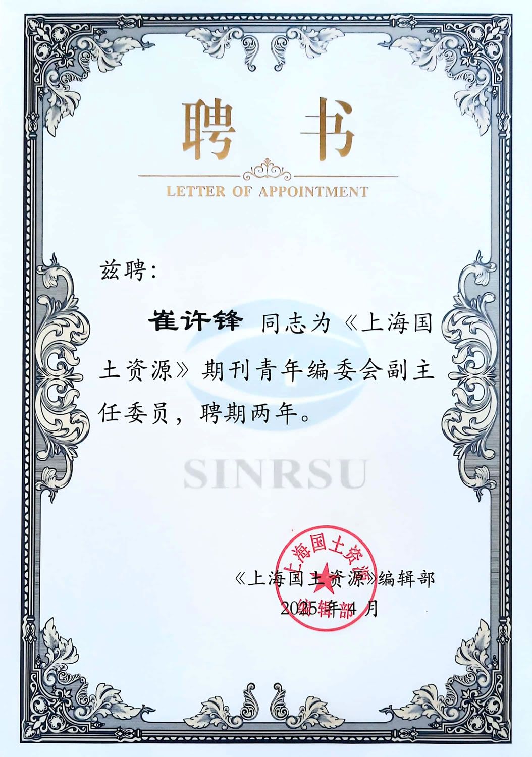 《上海国土资源》首届青年编委会副主任,与来自南开大学、华中师范大学、华中农业大学等高校及科研单位的专家共同组成青年编委会核心团队,杨联萍理事长与王寒梅院长共同为崔许锋副教授颁发编委聘书。