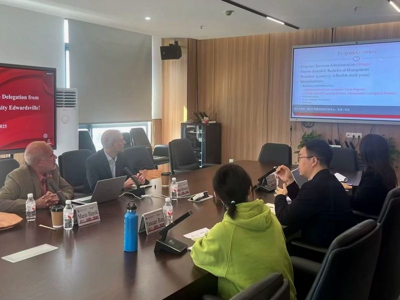 2025年11月5日,美国南伊利诺伊大学爱德华兹维尔分校(Southern Illinois University Edwardsville)商学院院长Mario Hayek教授与该校研究生与国际招生主任James Monahan先生到访米兰电竞·(中国区)工商管理学院,围绕多层次教育合作事宜开展深入交流。此次会谈开启了我院与美方高校合作的新征程,为共同谱写高水平国际交流新篇章奠定了坚实基础。