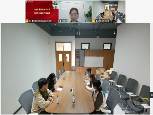 制度建设是组织长效发展的保障。会议首先聚焦院研究生会现行制度体系进行梳理和完善。院研会主席团全体成员于线上线下两端重点讨论了《工商管理学院研究生会章程》及配套制定的一系列具体规章。讨论范围涵盖组织原则、人员更迭、权责边界,能力培养和日常管理等各个维度的全方位覆盖。主席团执行主席朱泉提到,当前院研会已形成以章程为核心、多项实施细则为支撑的制度框架,需要继续在实践中不断检验和改进,为未来工作的系统化、科学化发展提供有力支撑。