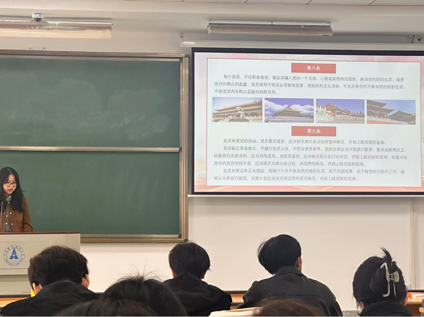 任诗雨同学以《中国共产党思想政治工作条例》为核心开展专题领学。从指导思想、地位作用、根本任务、内容重点、方法路径、阵地建设、队伍建设、责任落实、保障监督九个方面,系统解读条例要求;结合“教育是国之大计、党之大计”的重要论断,强调党员要做到专业学习与思想武装并重、个人成长与服务国家结合,在集体中发挥模范带头作用。