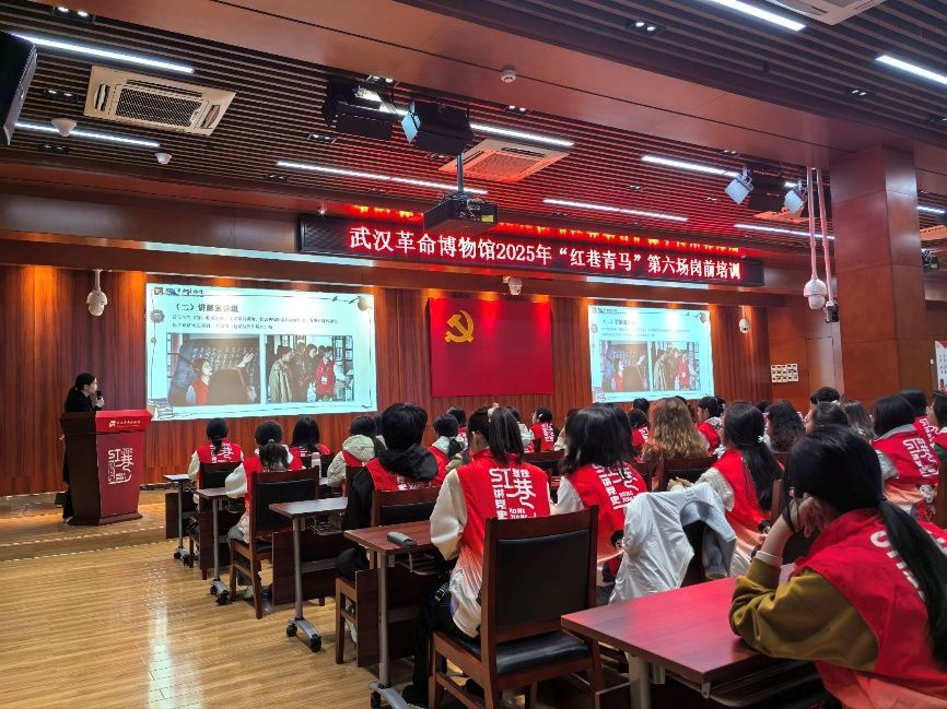 听涛起雄心,培训成壮志。面试结束后,志愿者们筛选出二十名表现优异的面试者,带领他们在武汉革命博物馆进行岗前培训。培训过程中,义讲员们全神贯注,从讲解的礼仪、流程到技巧,他们都以最专注的态度一一学习,不时低头记下重点。培训结束,馆方工作人员带队参观场馆。活动最后,义讲员与志愿者在纪律建设历史陈列馆前合影留念,将对革命文化的热爱留在照片中。