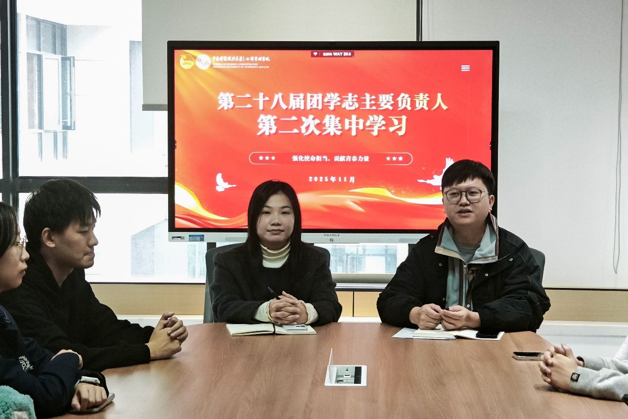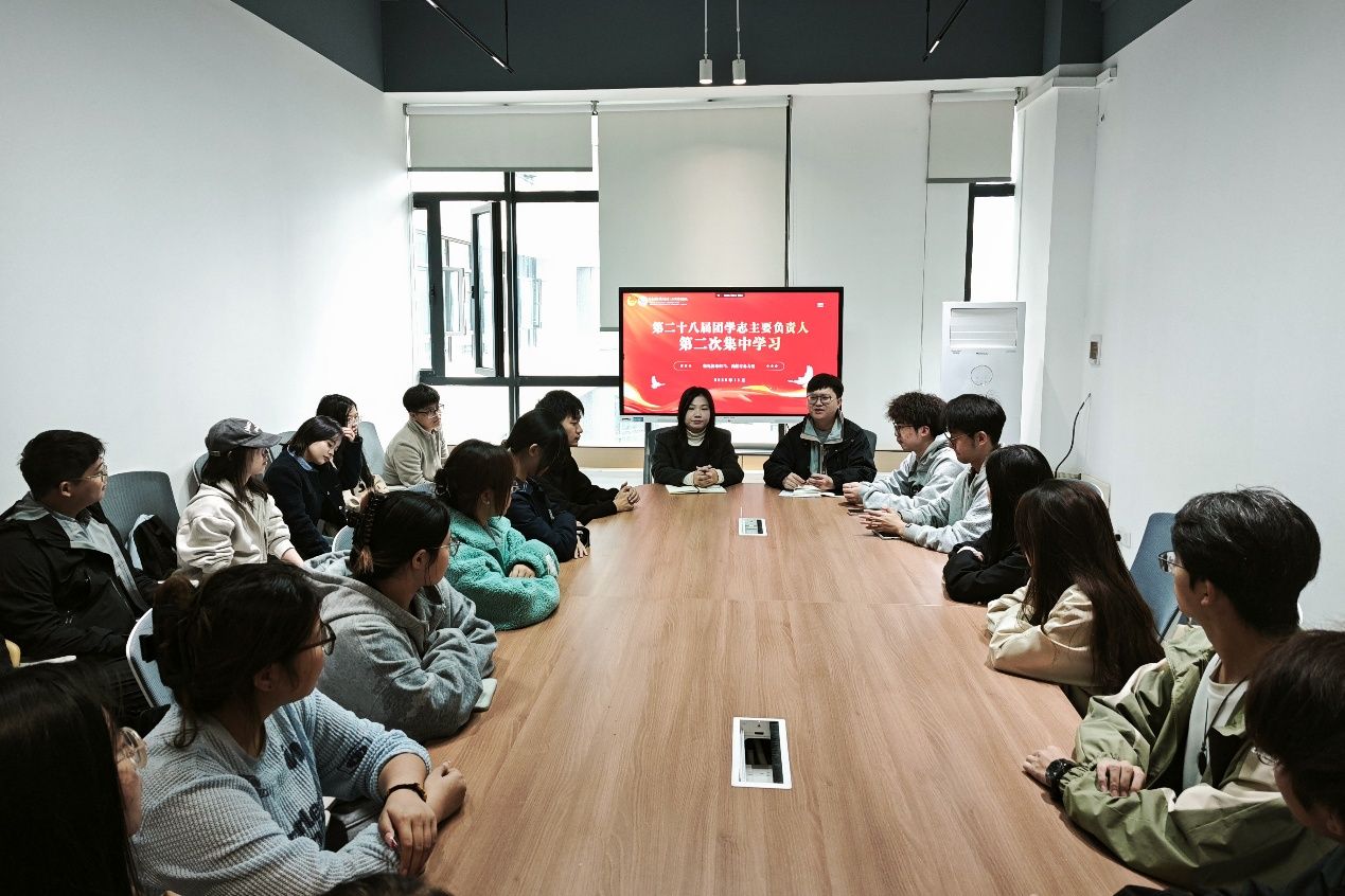 (通讯员 许磊 张夏菡)11月6日下午,工商管理学院在文瀚楼进行第二十八届团学志主要负责人第二次集中学习。本次会议由分团委书记何强主持,团委指导老师潘俊颐与各团学组织骨干共同参会。