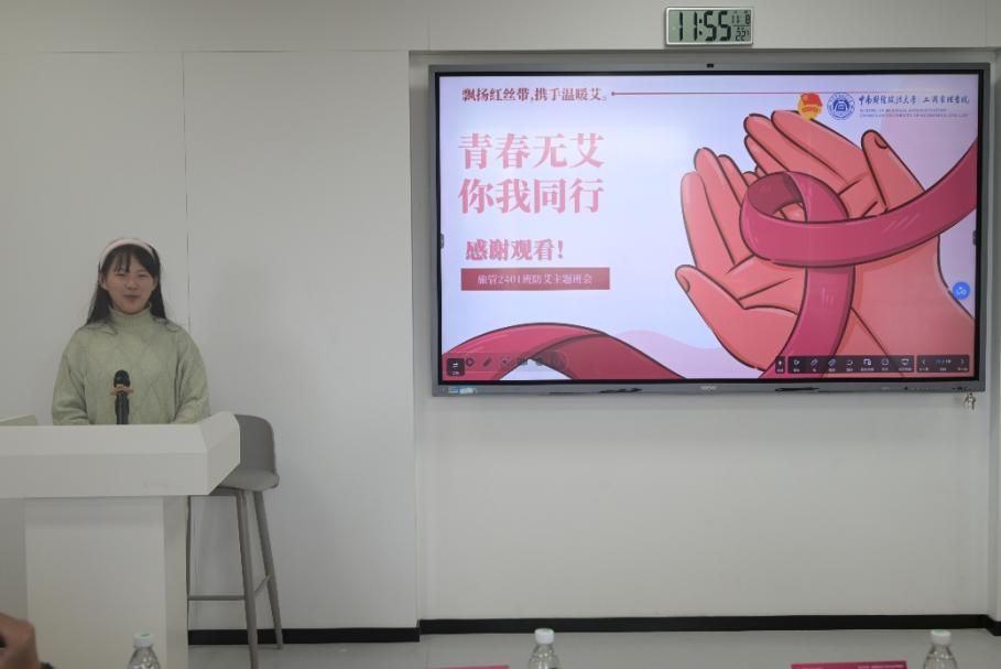 活动伊始,班长刘诗蕊以“飘扬红丝带,携手温暖‘艾’”为主题,详细介绍了本次主题班会的背景与流程,引导同学们从认知起点出发,共同踏上防艾知识的学习之旅,为整个活动奠定了严肃而温暖的基调。