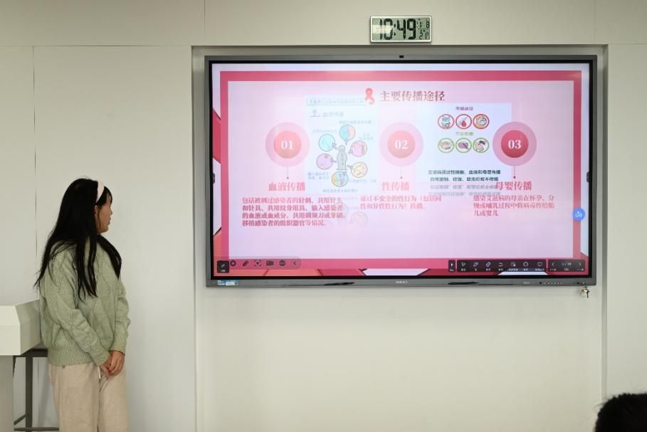 随后,班长刘诗蕊带领同学们系统回顾了人类对艾滋病的认知发展历程,深入讲解了艾滋病的研究进程以及地域分布特征,并结合“避免共用针具”、“保持安全性行为”以及“预防性用药”等具体措施,帮助同学们树立科学、理性的防艾观念,并强化了同学们的防护意识。