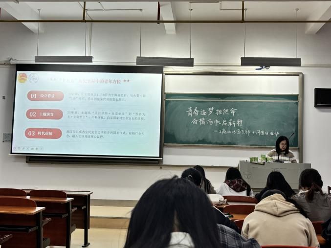 第四部分,唐欣同学带领同学们聚焦“青春执笔绘宏图”这一主题,强调了安全发展观对新时代国家治理的根本性意义——这既是应对风险挑战的“压舱石”,也是实现高质量发展的“护航舰”。此次分享不仅提升了同学们对总体国家安全观的理论认知,更激发了大家“国家安全,人人有责”的责任担当,为青年在新时代践行安全发展理念指明了行动方向。