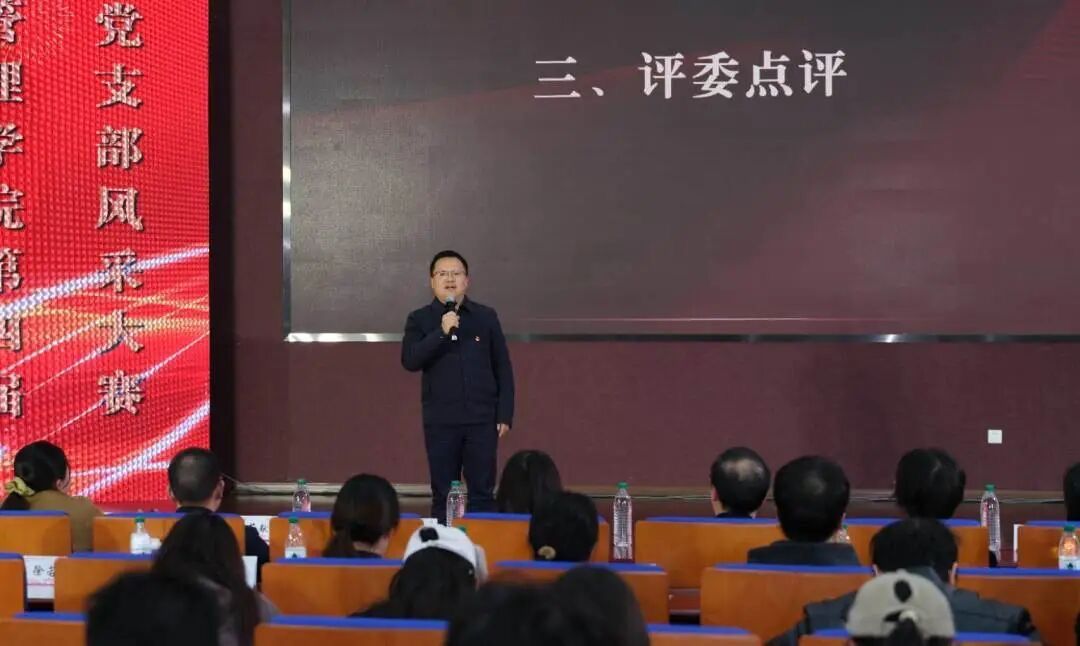 随后,校党委组织部副部长屈代洲对本次风采大赛进行点评。他指出,本次风采大赛以“赓续抗战精神血脉,筑牢支部战斗堡垒”为主题,展现出“三个多”的鲜明特点:多形式呈现抗战精神,多视角讲述英雄故事,多主线贯穿历史脉络;体现了“三个有”的活动成效:展示有高度、学生有担当、内容有格局。他强调,本次风采大赛讲好抗战精神、讲好时代故事,是一堂入脑入心的思政课,也是一次与党建深度融合的生动实践,希望同学们借此将工商管理学院创新形式的思政育人模式宣传推广出去。
