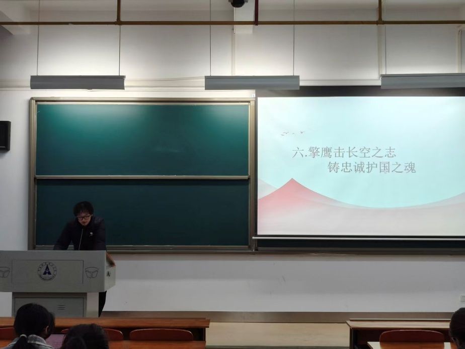 擎鹰击长空之志,铸忠诚护国之魂。在人民空军成立76周年之际,韦烨同学带领同学们观看了空军宣传片《空天自有英雄气》,重温人民空军从无到有、从弱到强的光辉历程。同学们被空军英雄胸怀凌云壮志、捍卫祖国蓝天的精神深深感动,进一步坚定了爱国强军、忠诚报国的理想信念。