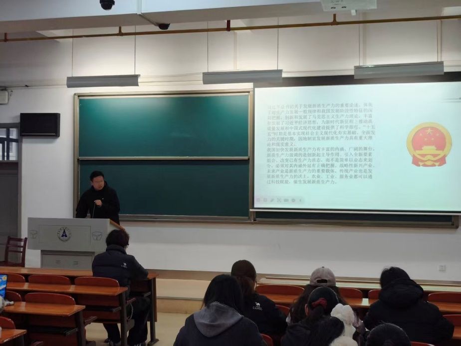 万里征程再出发,青春作笔绘宏图。马跃同学带领大家学习了中国共产党第二十届中央委员会第四次全体会议精神和习近平总书记关于发展新质生产力的重要论述。通过学习,同学们深刻认识到“十五五”时期是全面建设社会主义现代化国家的关键阶段,作为新时代大学生,应主动把握时代机遇,夯实专业基础,培养创新思维,为发展新质生产力、推动高质量发展贡献青春智慧。