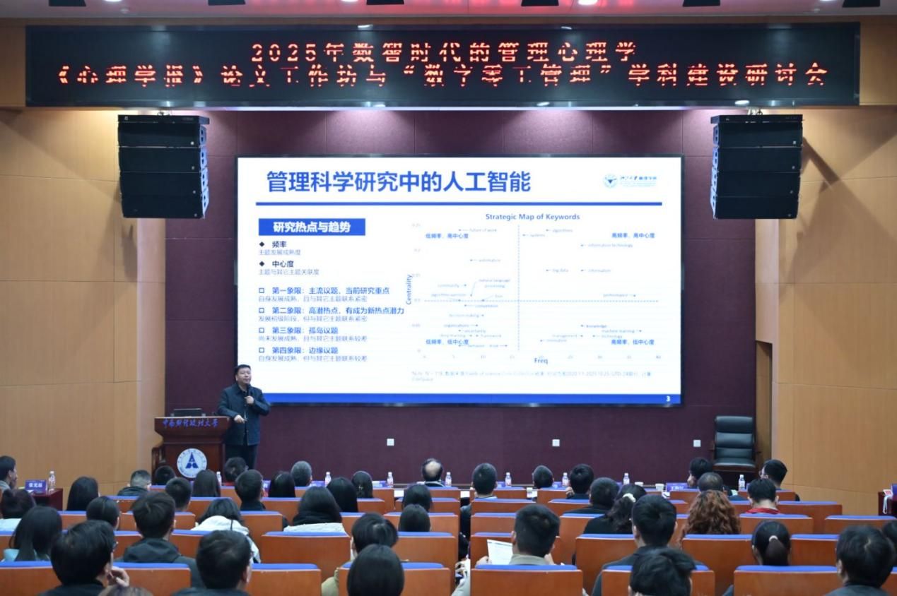 前两场主旨报告由武汉理工大学管理学院张光磊教授主持。浙江大学管理学院施俊琦教授主讲,以“人工智能时代的人力资源管理研究”为主题展开报告。施教授指出,人工智能技术正深度渗透管理科学研究领域,UTD数据库中AI或LLMs相关主题论文占比已达总量的3%左右。他从研究主题、研究方法与研究理论三个维度,系统剖析了人工智能对人力资源管理(HRM)研究的重构作用,并通过对比“十三五”至“十四五”期间的学术成果演进,总结出新技术催生新议题、新环境赋能旧议题、经典研究持续深化三大发展趋势。施教授强调,未来管理学科研究需紧密结合企业实践,积极拥抱开放性科学理念,构建理论与实践互促共生的研究生态。