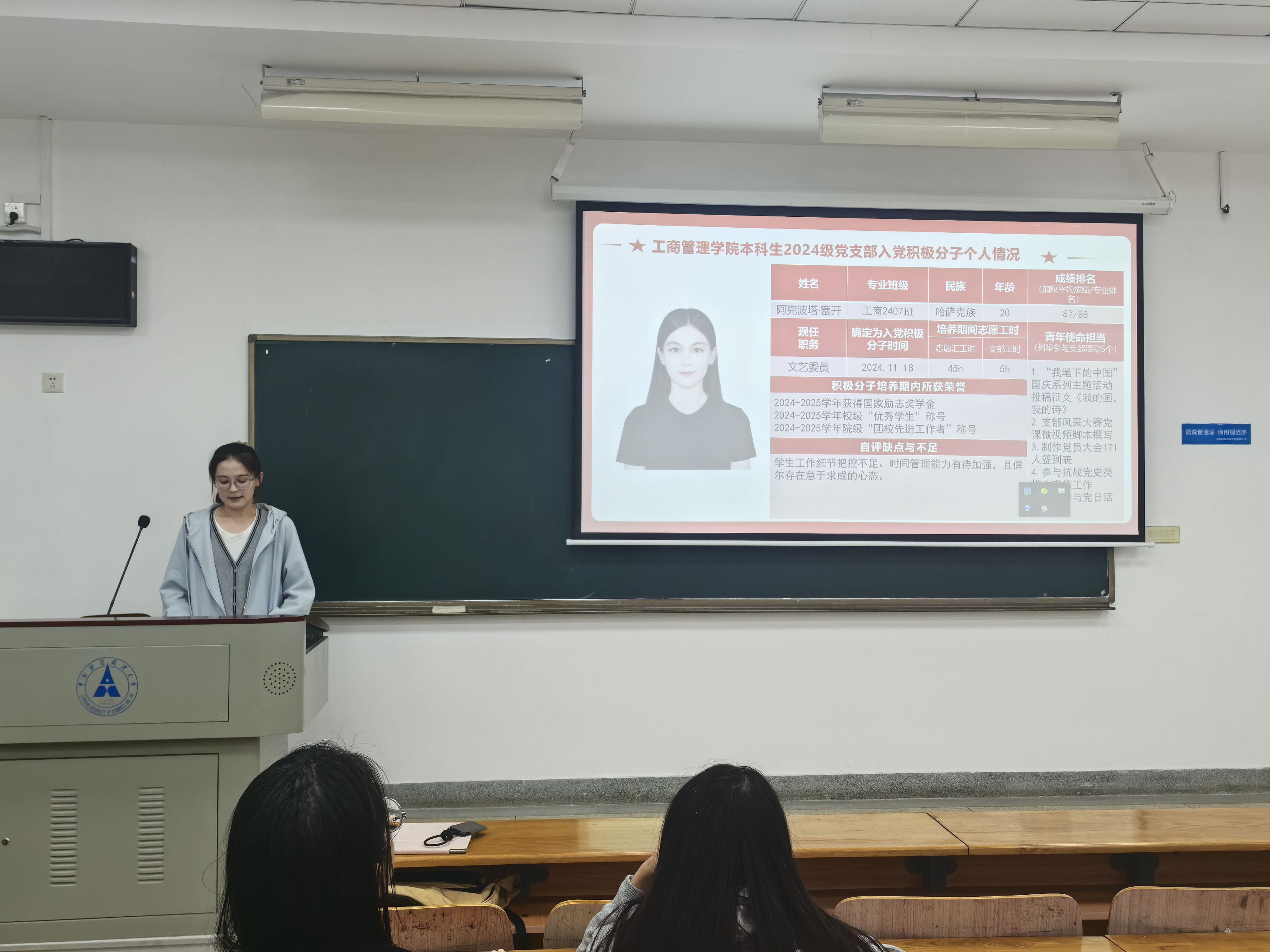 在本次团员大会上,苏钰瑶、陈俊、阿克波塔·塞开三位入党积极分子依次进行个人汇报答辩,三位同学汇报逻辑清晰、态度诚恳,充分展现了青年团员的良好风貌。