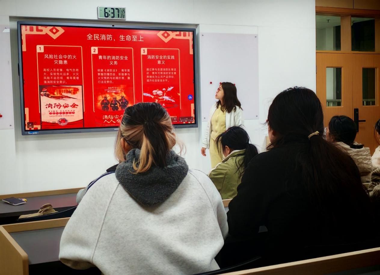 活动第二项,全国消防日安全教育宣讲。11月9日是全国消防日。为学习贯彻习近平总书记关于安全生产的重要指示精神,坚持统筹发展和安全,李佳欣为大家展示了优秀海报,并分享了日常生活中的火灾隐患与消防安全活动的实践意义,引领同学们增强消防安全意识,防患于未然,避险于未发。