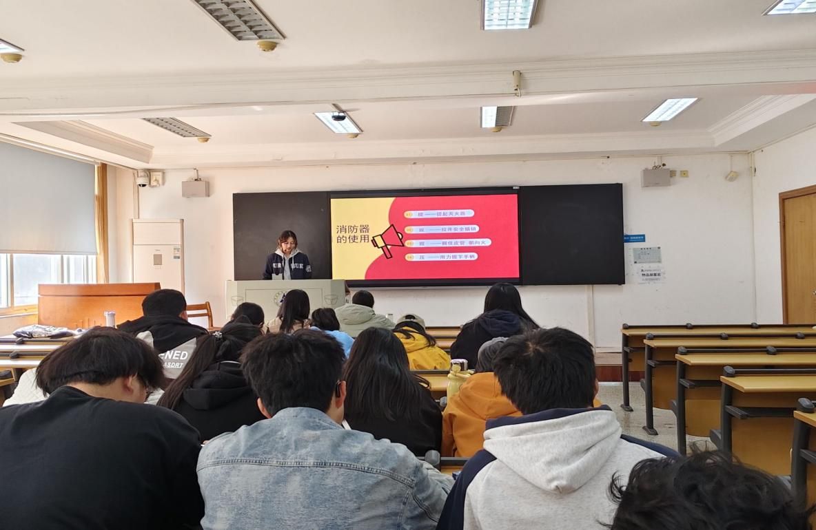 紧接着,在消防知识学习环节,班级组织观看科普灭火器使用方法的视频,记住了“提拔握压″这一口诀。为了学以致用,团支书还设置了消防知识竞答的小游戏,并适时提问灭火器使用口诀,同学们积极踊跃回答问题,加深了对消防知识的印象,提高了消防意识。最后阶段由赫美鑫同学进行消防案例分析,总结经验教训,并对大家提出关于消防安全的倡议。