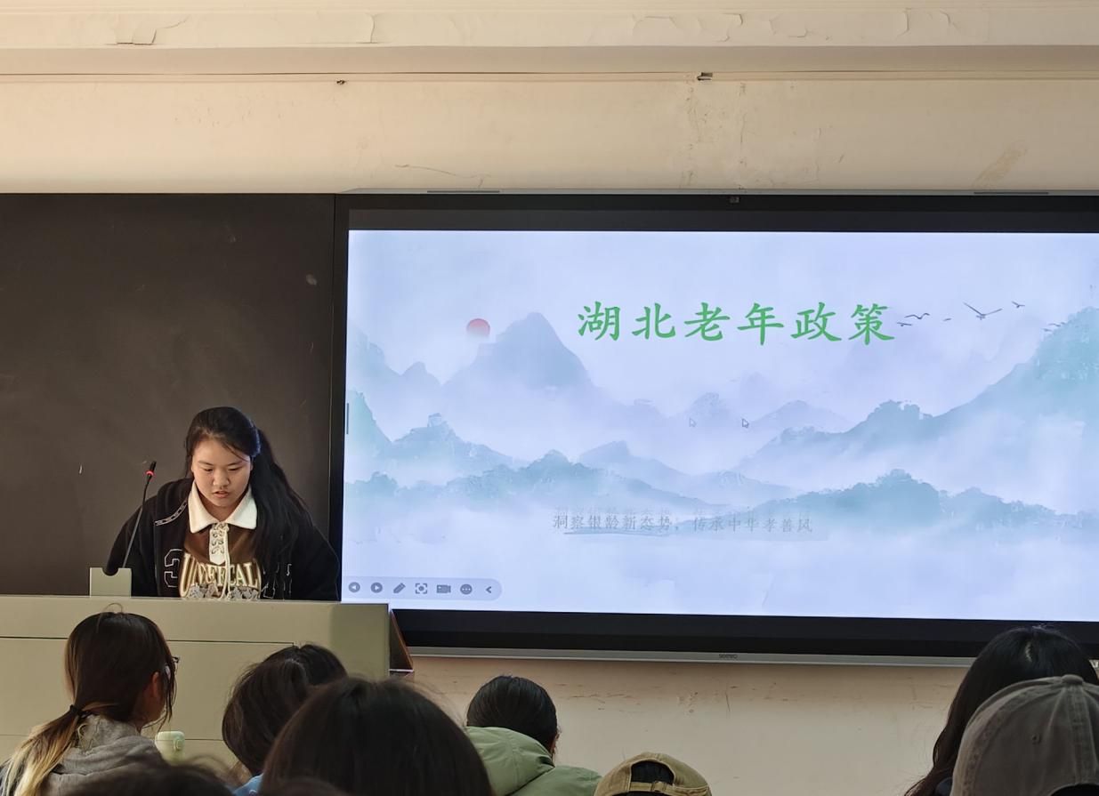 在“洞察银龄新态势,传承中华孝善风”的版块,方吉娥同学阐释了从养老金、医疗、法律保障与权益维护等多方面展示湖北的老年政策和养老体系,并展示了湖北在养老事业方面取得的成果,让同学们进一步洞察中国共产党领导下中国的养老政策取得的成效,同时认识到了助老扶老作为中华优秀传统美德在当代中国的体现。