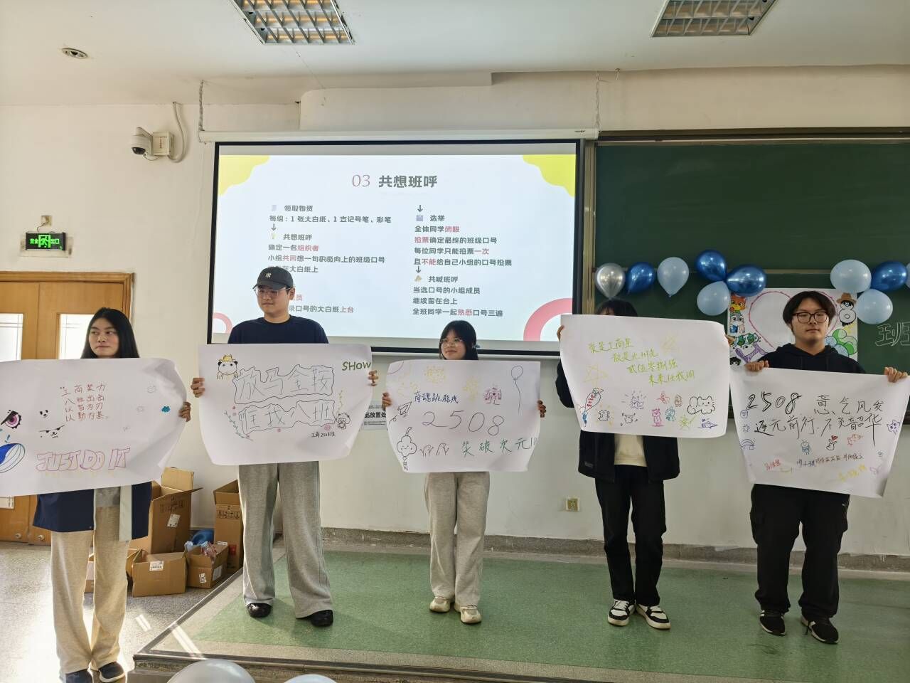 活动第三项,进入“共想班呼”环节,同学们以组为单位纷纷在纸上写下自己对班级的美好愿景。这并非简单的口号征集,而是一次集体智慧的火花碰撞,将同学们的共同愿景、品格与力量凝炼成一句铮铮誓言。现场同学在头脑风暴中搭建思想桥梁,为班级共同体的未来发出最响亮的声音。