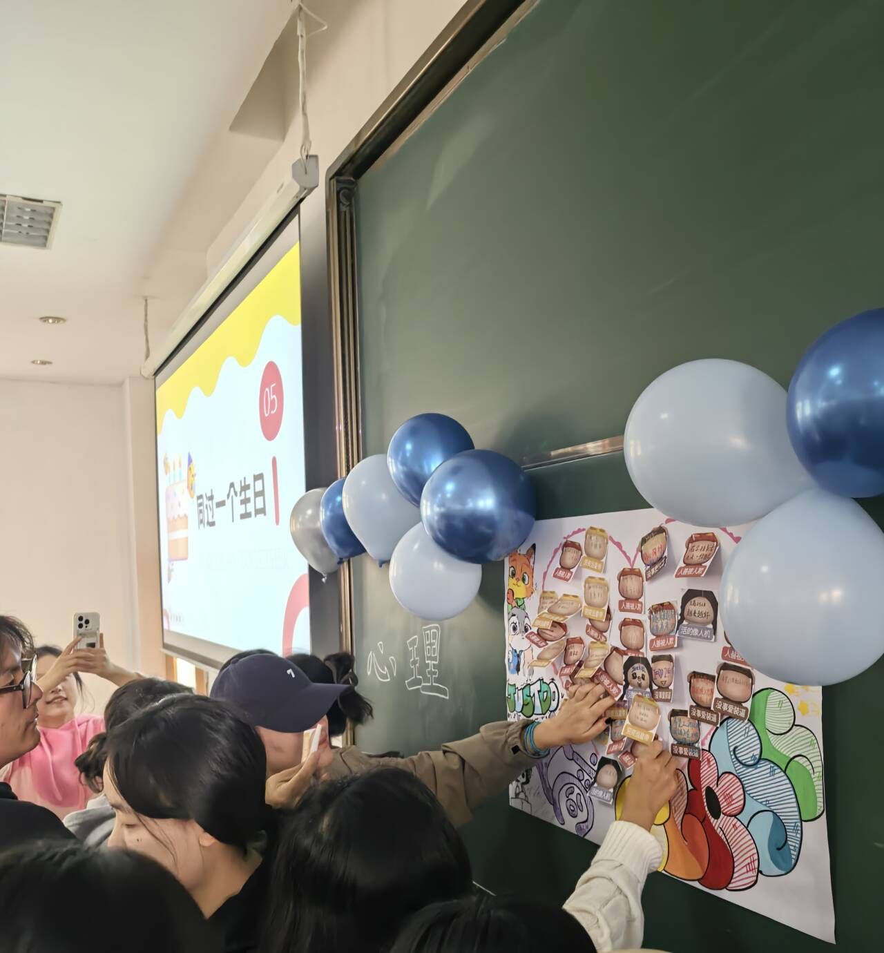 活动第五项,进入到最终环节-“同过一个生日”,现场同学在便利贴上写下对班级的祝福。每一笔,都是智慧的沉淀;每一划,都是情感的流淌。而后,同学们把便利贴张贴在海报的心形区域,构建出属于我们的“心之象征”。这些承载着无尽希冀的祝福,将会是我们集体最为珍贵的记忆宝藏。