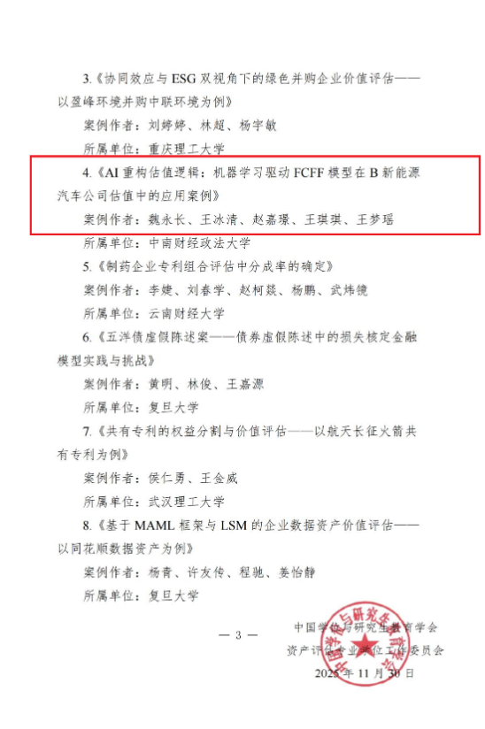 2025年12月1日,中国学位与研究生教育学会资产评估专业学位工作委员会公布了“中和杯”第十三届资产评估教学案例大赛获奖成果名单。工商管理学院工商管理系魏永长副教授团队(魏永长、王冰清、赵嘉璟、王琪琪、王梦瑶)申报的案例《AI重构估值逻辑:机器学习驱动FCFF模型在B新能源汽车公司估值中的应用案例》成功入选并荣获三等奖,实现我院在该权威赛事中的又一突破。