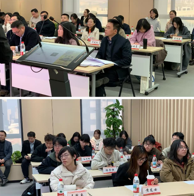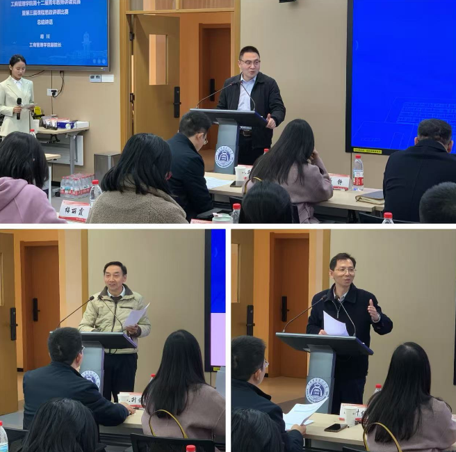 教学展示结束后,熊胜绪教授、费显政教授和胡川副院长作为专家依次对几位参赛选手进行了点评和总结。熊胜绪教授总结出本次竞赛的四大亮点:一是教案准备充分详细,二是以学生为中心,三是较好的运用AI技术并引入课堂,四是各位老师都有很好的仪表仪态。同时熊老师建议老师们要将思政教育融入到课堂教学中,结合学校打造一流本科教程的要求,思考如何适应“金课标准”,更加高效地培养学生的综合能力。费显政教授在点评前也回顾了自己早年前参加青教赛的经历,深有感触的对今天的几位选手给予肯定和厚望。不仅从课程思政教育的价值引导,而且对老师教学转型也提出了宝贵的建议。最后他希望与全体老师共同努力,携手应对新时代教学方式的改革。胡川副院长对本次活动给予了很高的评价,他回顾了工商管理学院教学比赛方面有着非常悠久的历史,有着深厚的积淀,因此才涌现出一批批优秀的教学人才。他强调在数字化背景下,老师们要更加重视人才的培养,要立足当下,将以此次赛事为契机,持续完善青年教师“教学+科研”双驱动培养机制,创造更多的赛事平台,推动青年教师在教学实践中深耕学科内涵、创新育人模式、为培养更多专业人才筑牢教学根基。