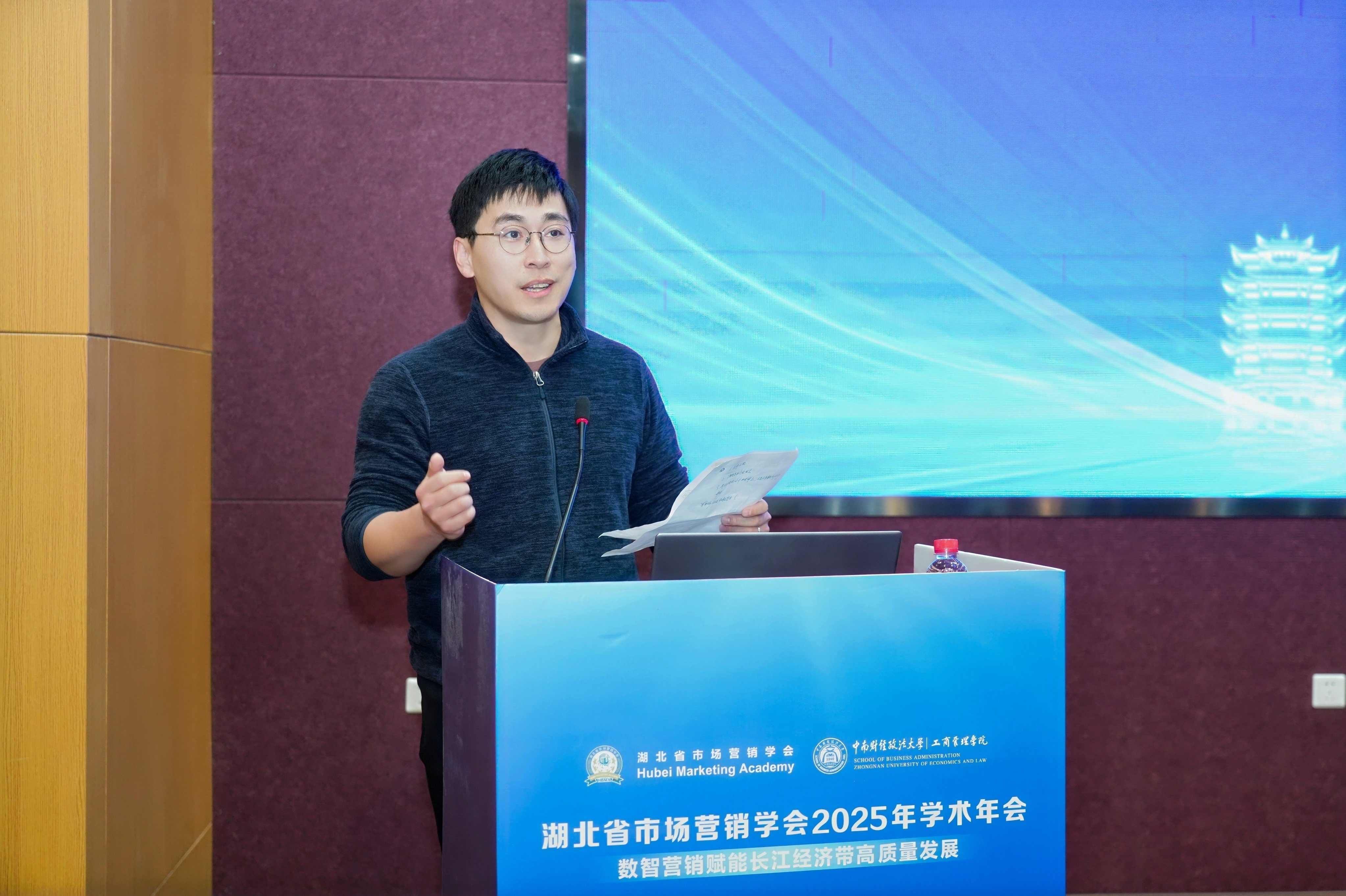 大会学界报告环节由湖北省市场营销学会副会长陈涛教授、张广玲教授及长江大学经济管理学院院长陈承教授共同主持。SKEMA商学院窦文宇教授分享了AI技术在高等教育与商业研究中的应用,指出AI可依托真实数据库高效完成信息筛选与内容生成,科学引导能显著提升研究效率。米兰电竞·(中国区)孙洪庆副教授围绕"AIGC重塑内容营销边界"主题,分析了普通人入局新媒体营销的机遇与挑战,提出精准定位、差异化创作与情绪价值挖掘等实用路径。武汉大学孟陆副教授基于"设备重塑决策"研究,指出手机端用户因"污染效应"更偏好有包装食品且可持续消费意愿较低,建议企业通过调整广告诉求提升移动端用户的绿色购买行为。