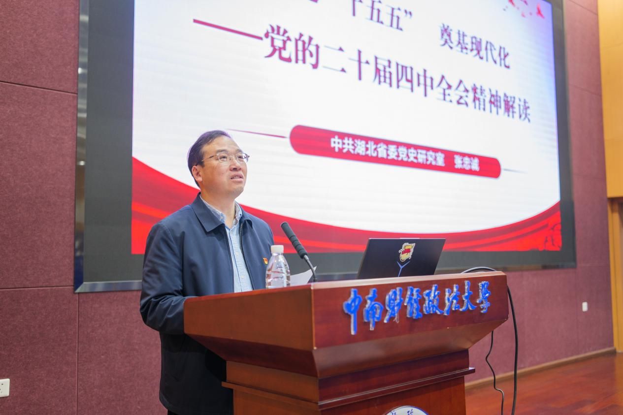在第一场专题报告中,张忠诚主任以“锚定‘十五五’奠基现代化--党的二十届四中全会精神解读”为题, 从国家战略发展与湖北实际相结合的多重维度,对全会精神的核心要义进行了深刻阐释。他引导师生从“中国式现代化的十三条实践路径”、“现代化比较维度”、“制度变迁维度”及“社会发展维度”等多重视角,深刻领悟党的二十届四中全会精神。张忠诚主任详细解读了全会提出的“五力跃升”、“加快发展新质生产力”、“推进制度型开放”等一系列战略部署,指出这些创新举措共同构建了中国式现代化的系统范式,实现了对西方现代化模式的多维度超越,为发展中国家提供了全新的选择。张主任他强调,全会确立的“进一步全面深化改革取得新突破”目标,深刻指向国家治理体系和治理能力现代化,彰显了中国特色社会主义制度的显著优势与演进逻辑全会确立的未来五年“进一步全面深化改革取得新突破”的目标,深刻揭示了中国特色社会主义制度变迁的核心旨归——实现国家治理体系和治理能力现代化。