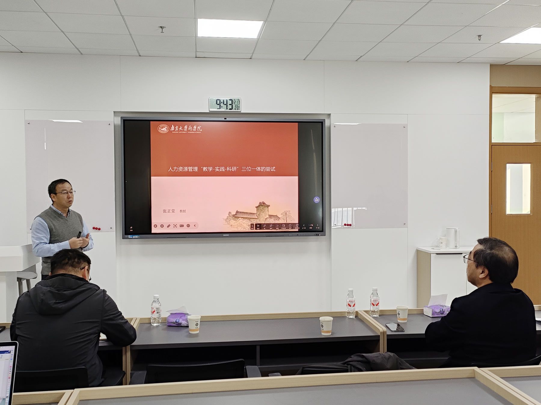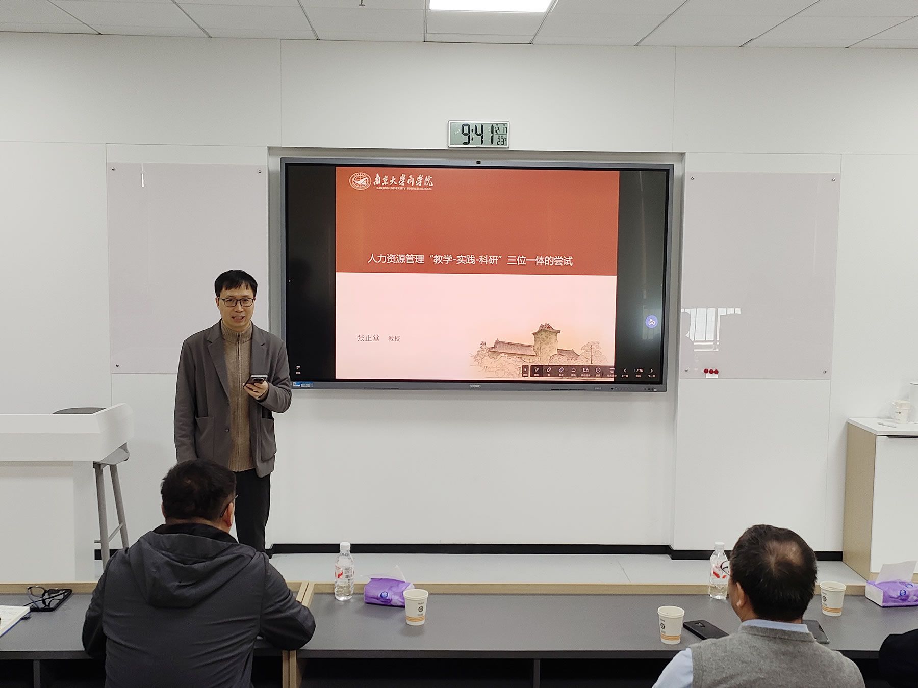 2025年12月17日上午9:30-10:30,工商管理学院人力资源管理系在文瀚楼东601室举办专题讲座。南京大学商学院教授、博士生导师、管理学院副院长、《人力资源管理评论》执行主编张正堂教授应邀作题为《人力资源管理“教学-实践-科研”的三位一体》的报告,工商管理学院副院长董慈蔚教授主持活动