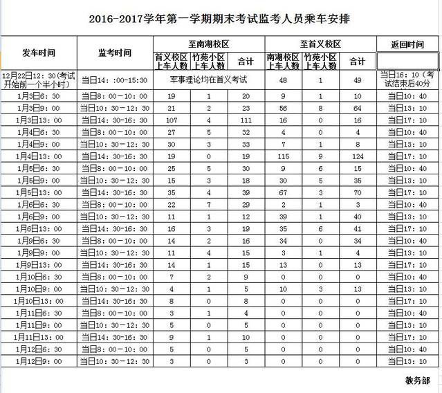 期末考试期间,职工班车运行不变;政治学习班车不变;教师班车1月6日晚停止运行;研究生上课班车1月6日晚停止运行。