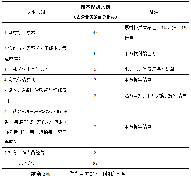 二、招标方式:本次公开招标采取固定劳务费发放比例的方式。合作双方实行成本核算。特色档口合作运营成本核算方案如下表: