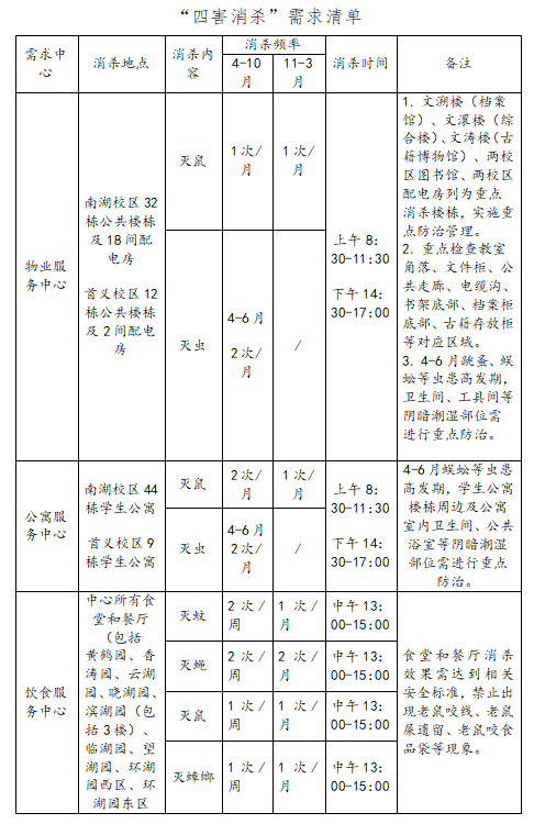 集中消杀管理:根据校方现场实际情况制定专项消杀方案,重点在虫鼠患高发季节,保证消杀效果。确定消杀日期后,提前在待消杀楼栋张贴通知,做好准备工作。